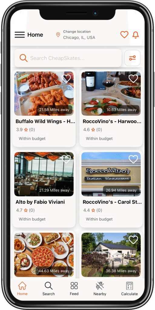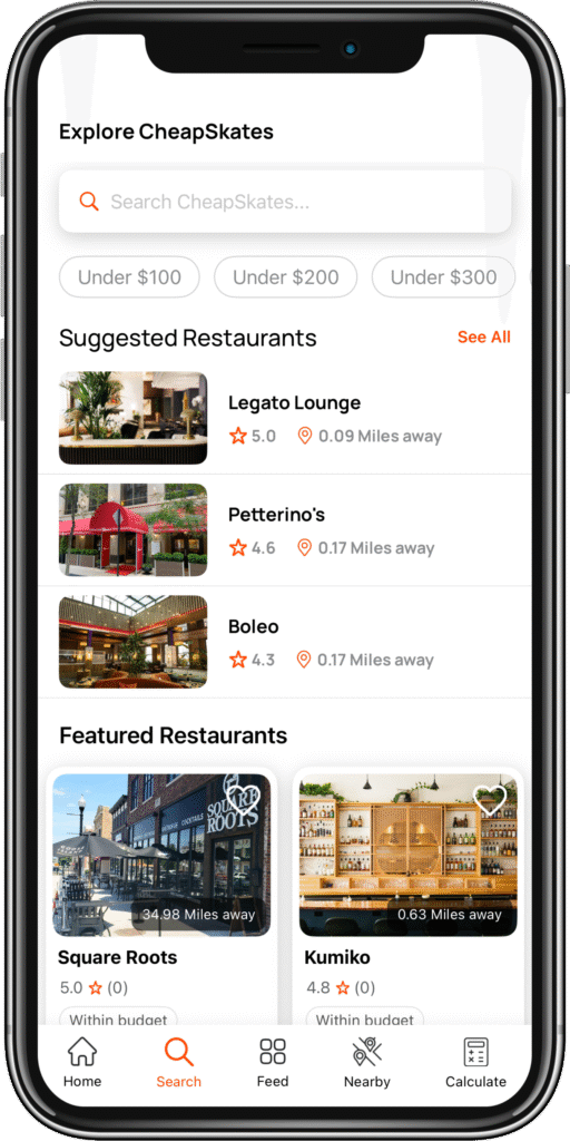 Enter Cheapskates, the first app that flips the script: instead of picking a restaurant and hoping the bill fits, you set your budget—and Cheapskates finds the restaurants that match it. Cheapskates is easy to use. Simply download the app and create your profile with your location, choose your cuisine: Italian, Chinese, American, Vegetarian, and more.